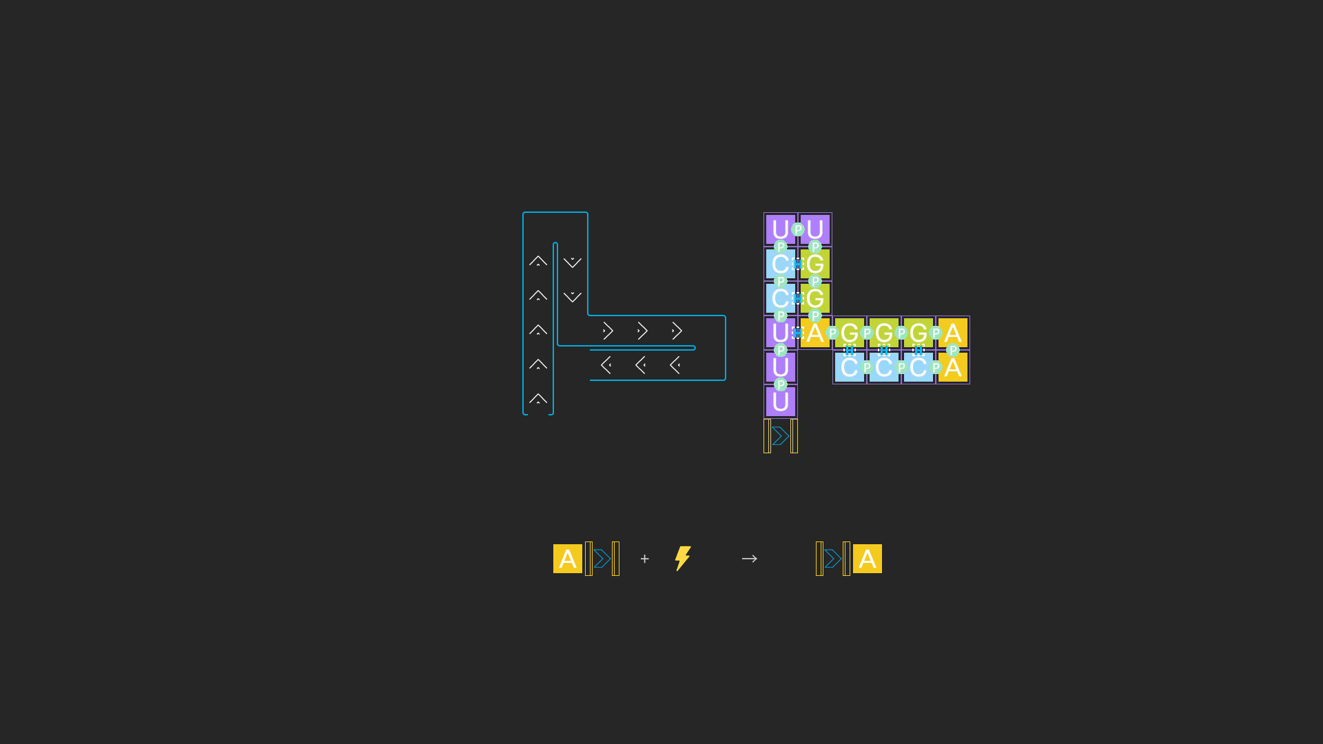 Gameplay goal of the current version: To create a structure capable of automatically producing target RNA based on template RNA.